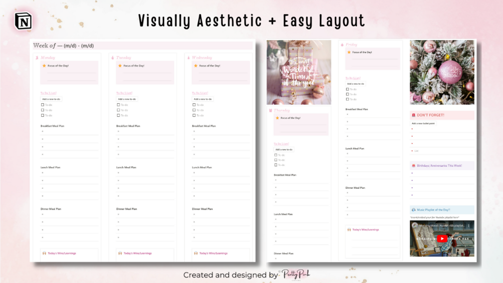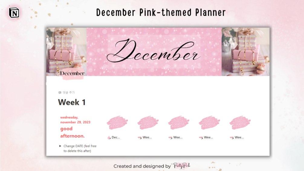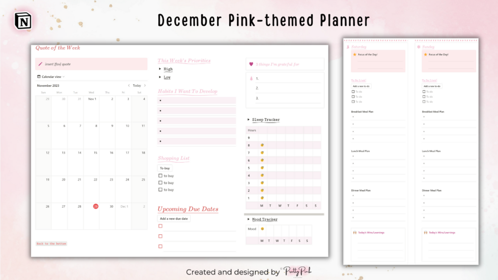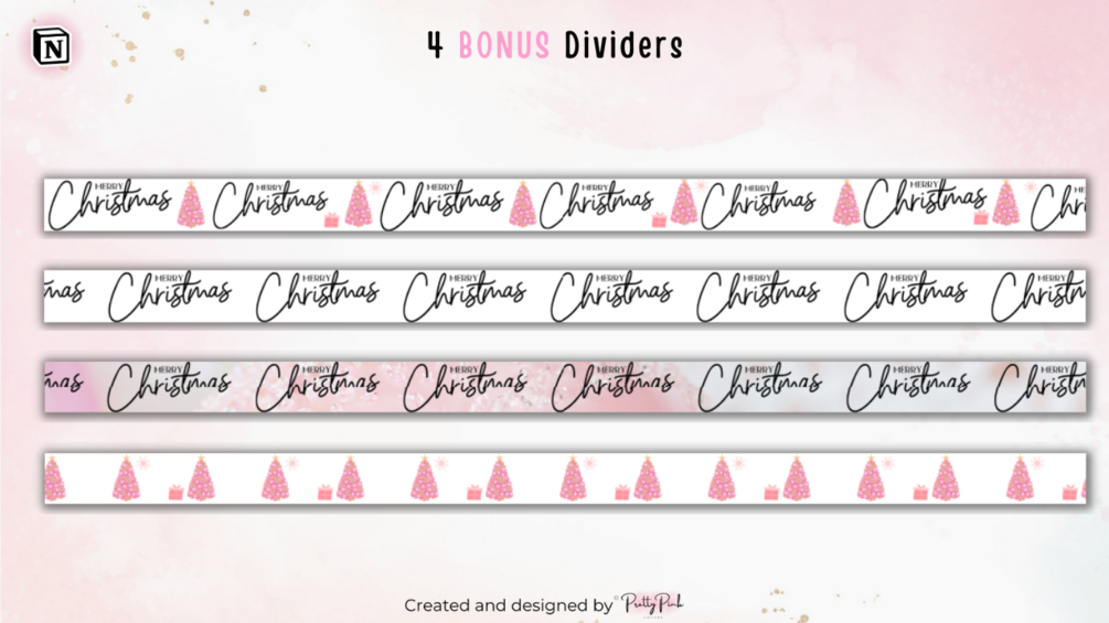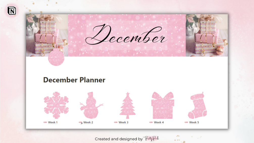 Get organized and boost your productivity with The December Planner (Pink Christmas Edition) Notion template! This template is designed with all the essential features you need to stay on top of your daily and weekly tasks for the month of December. From a to-do list, calendar view, goal/habit tracking, meal planning, and weekly reflections, this template has everything you need in one centralized location. Say goodbye to scattered notes and cluttered desk, and hello to a seamless and efficient planning experience with The December Planner (Pink Christmas Edition) Notion template!