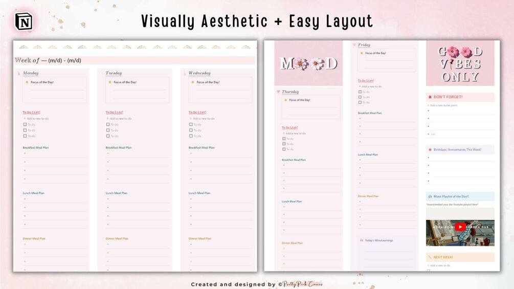 Get organized and boost your productivity with The Personal Planner Princess Theme 1.0 (Light Pink)! This template is designed with all the essential features you need to stay on top of your daily, weekly, and monthly tasks. From a to-do list, calendar view, goal/habit tracking, meal planning, and weekly reflections, this template has everything you need in one centralized location. Say goodbye to scattered notes and cluttered desk, and hello to a seamless and efficient planning experience with The Personal Planner Princess Theme 1.0 (Light Pink)!