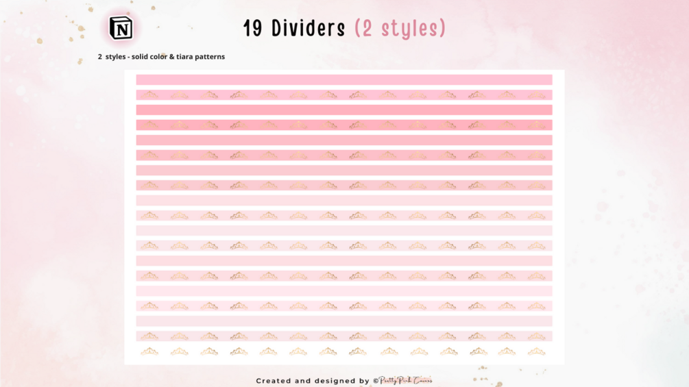 The 19 Dividers Set Princess Theme (Light Pink) are the perfect addition to add a bit of feminine style to your monthly or weekly Notion templates, providing a fun and stylish way to organize your monthly or weekly schedule.